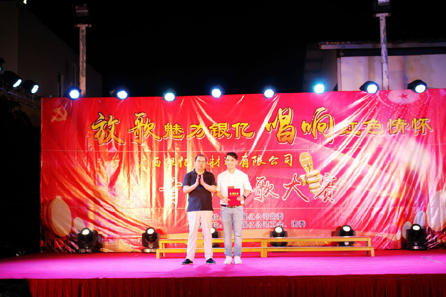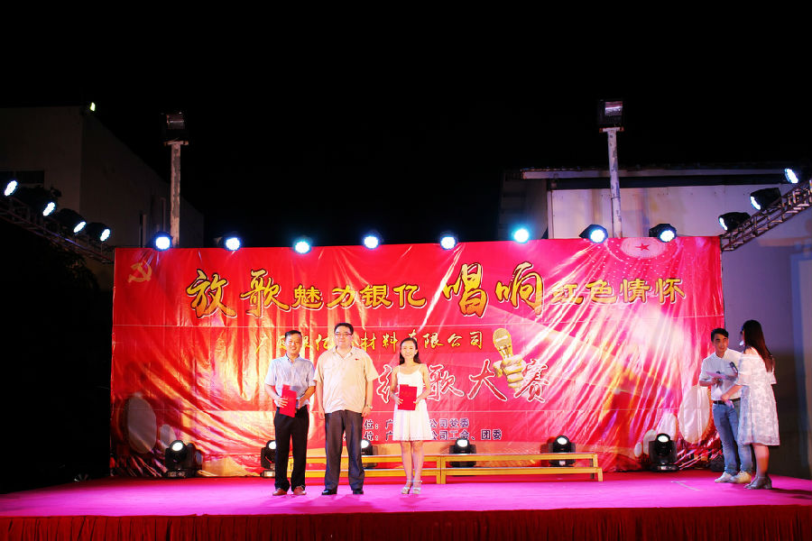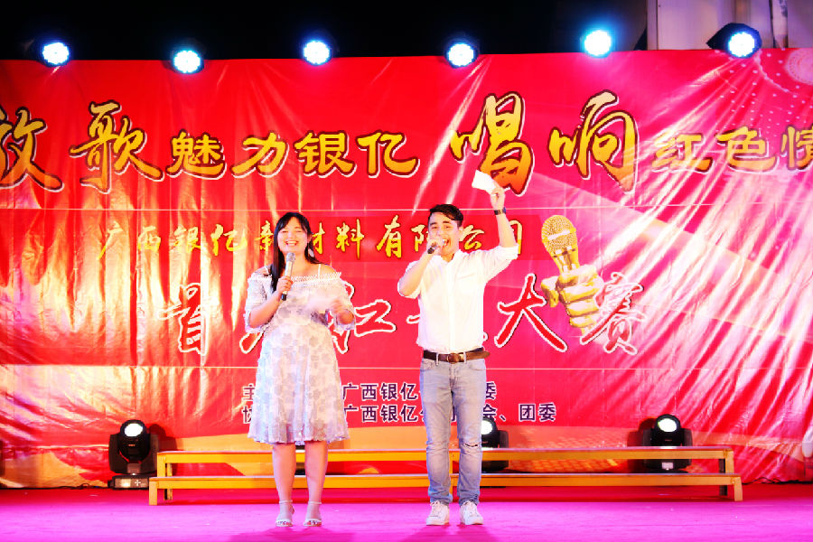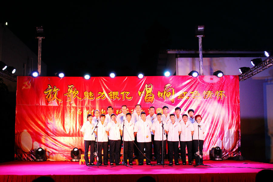 7時30分,風(fēng)度翩翩的主持人朱旭波、周海華大步走向舞臺中央,宣布紅歌比賽正式開始,廣西銀億黨委副書記王小豐發(fā)表了熱情洋溢的祝詞。
