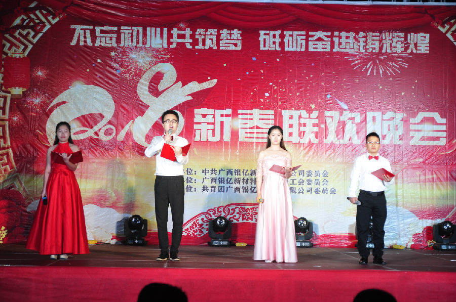 “送走金雞,又是一年激情的歲月;迎來瑞犬,又是一段如火的時光”。3月9日晚,廣西銀億新材料有限公司舉行了以“不忘初心共筑夢,砥礪奮進鑄輝煌”為主題的2018年新春聯(lián)歡晚會。出席晚會的嘉賓兼評委有廣西銀億總經理張學飛,副總經理任衛(wèi)東、陳為清、朱紅斌,黨委委員和潤秀,黨委委員兼工會主席章群宏。